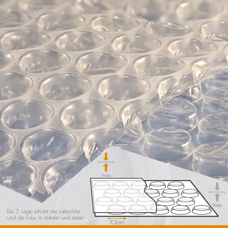 Insgesamt ist die dreilagige Luftpolsterfolie eine effektive und kostengünstige Möglichkeit, empfindliche Gegenstände sicher zu verpacken und zu versenden.